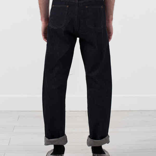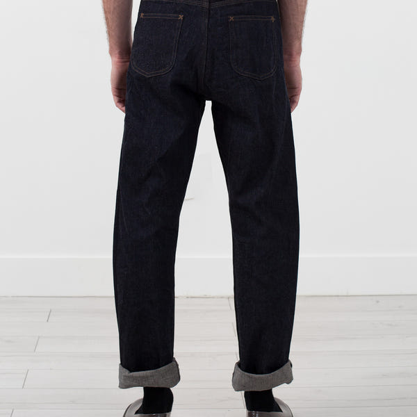 The 5 Pocket Jean by Nigel Cabourn is your denim go-to for every occasion. Cut from a stiff and irregular selvage denim, the shape of the leg resembles the original work denim, complete with a riveted copper cinch-back strap in back. Button fly closure at front. Color Indigo. 100% Cotton. Made in Japan. Jacob is wearing a 32.