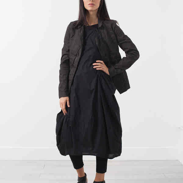 Made in Germany, the Rundholz Dip collection focuses on shape and volume while incorporating delicious materials. The Short Jacket is wrinkled to textured perfection. Button placket closure at front. Single pocket at right front. Color Mohne. 100% Cotton. Made in Germany. Ashley is wearing an X-Small.