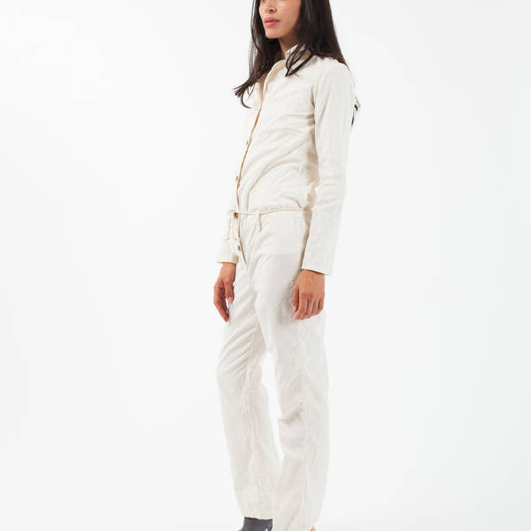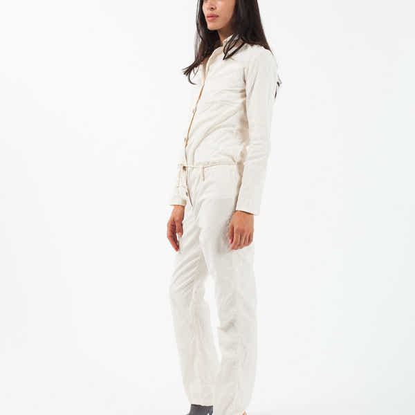 The Pip Jumpsuit is borrowed from the artist's smock, and reinvented. Lightweight and appropriate for all occasions. Button placket closure at front. Rope tie at waist. Pip-Squeak Chapeau. Color Natural. 100% Cotton. Made in U.S.A. Ashley is wearing a Small.