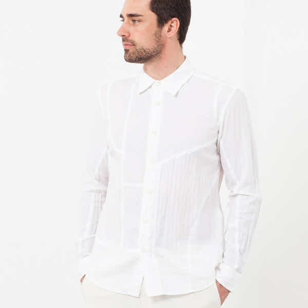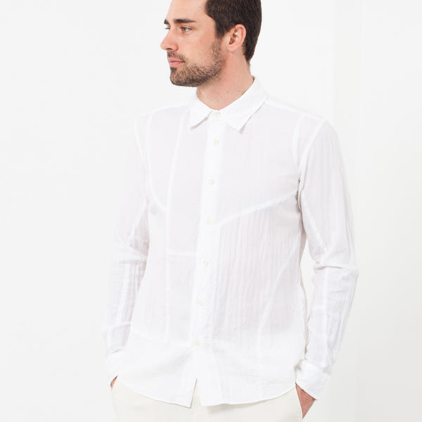 The Block Button Up from Sage de Cret acts as that staple top with uniqueness in the texture. Button placket closure at front. Color White. 60% Cotton, 40% Tencel. Made in Japan.  Jacob is wearing a Large.