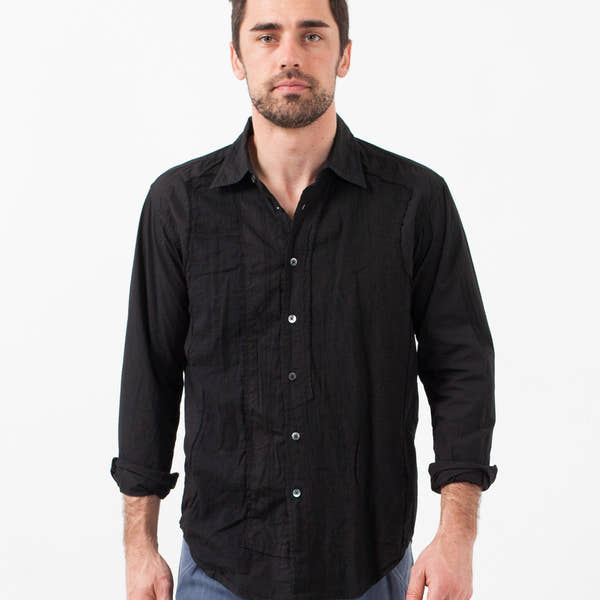 The Block Button Up from Sage de Cret acts as that staple top with uniqueness in the texture. Button placket closure at front. Color Black. 60% Cotton, 40% Tencel. Made in Japan. Jacob is wearing a Medium.