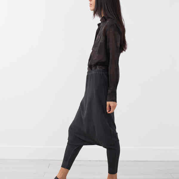 Where intelligence meets innovation, Rundholz presents the artistic mastery of structural and beautiful apparel. The Rundholz Black Label collection emphasizes accessibility in fashion. The Knitted Trouser takes on the hot drop crotch to statement levels. Knitted waistband with elastic for ease. Color Tang. 100% Cotton. Ashley is wearing an X-Small.