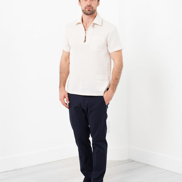 The Arrigo by Pence incorporates a unique micro pattern in the modern silhouette. Hook and eye closure with single button, zip fly at front. Four exterior pockets. Color Navy. 97% Cotton, 3% Elastane. Made in Romania. Jacob is wearing an Italian 48.