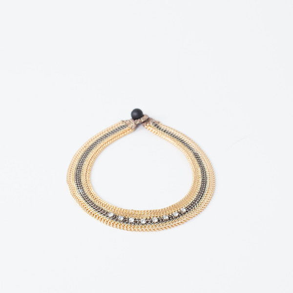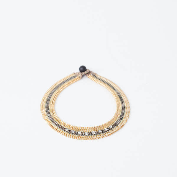 Quintessential elegance with delicate details. The statement collar necklace intertwines gems and mixed metals. Hook and ball closure. 5 Octobre. Color Grey. Gold Plated. Made in France.