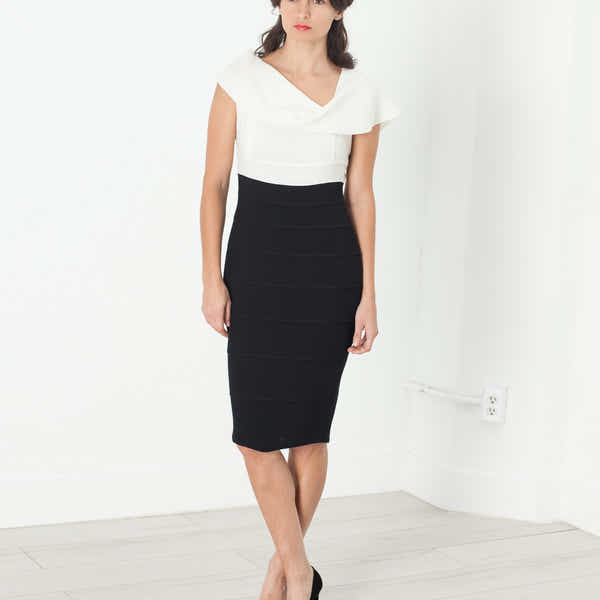 Hand crafted from concept to finished product, the Columbian label Amelia Toro is authentically kind and creative. Sleeveless dress with asymmetrical collar takes a traditional piece unforgettable. Interesting banded fabrication on front, long paneling in back. Back zip closure. Color Cream/Black. 100% Crepe Wool. Made in Columbia. Lana is wearing a Size 4.