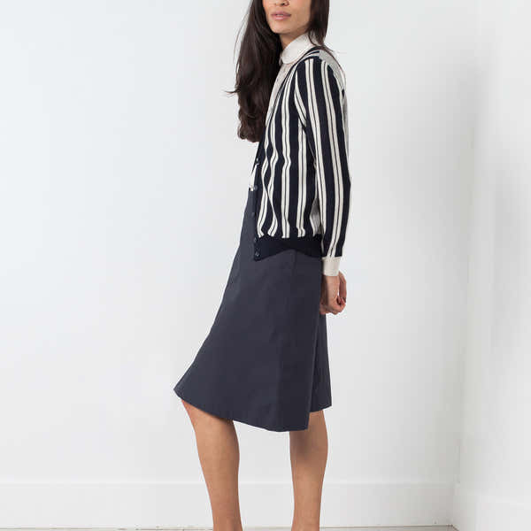 The Library from Yoshi Kondo offers an A-line silhouette to the knee with a clean aesthetic. Invisible zip closure at center back. Pockets at side. Color Navy. 100% Cotton. Ashley is wearing a Small.