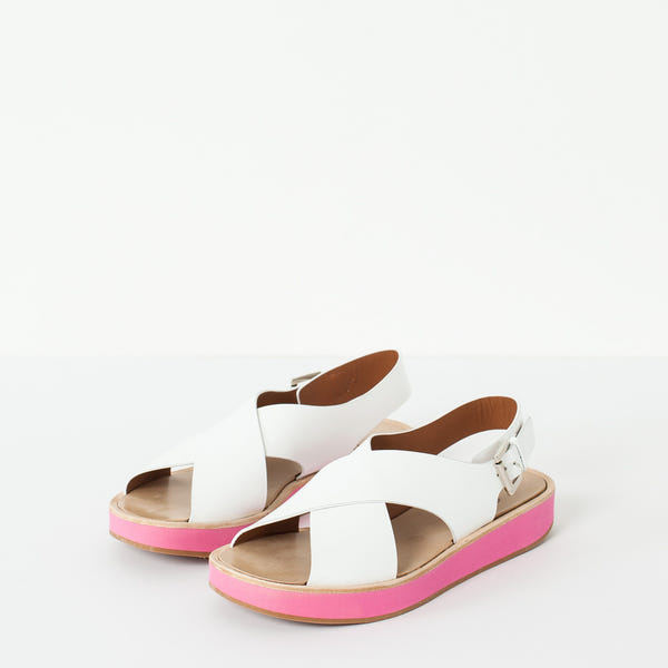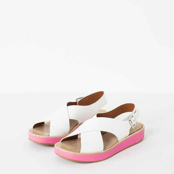 Fun straps paired with bright colors makes the French shoe label Flamingos perfect for summertime. With Anne Blum at its helm, this label effuses creativity in style and just the right amount of play. X marks the spot with the Avalon. Crossing straps wrap the foot in soft leather with a slight shimmer. Buckle closure. Color White. 100% Calf leather upper, row cut, synthetic EVA sole. Leather lined. Made in Spain.