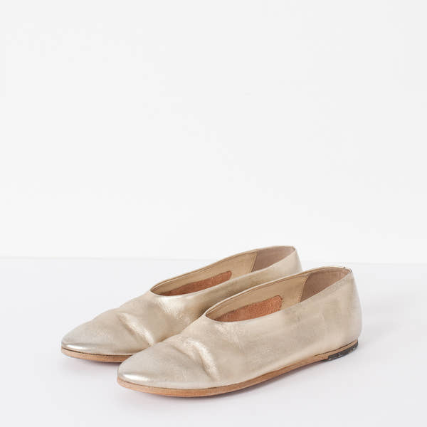 Married aesthetics of innovation and tradition, Marséll crafts shoes of mastering technique. Where modern classism takes wearable shape, anticipate artistic expression epitomized in leather footwear. The Ballerina Flat is brings out that inner shine! Rustic from composition with the sleekest finish. Color Gold. 100% Leather. Made in Italy.