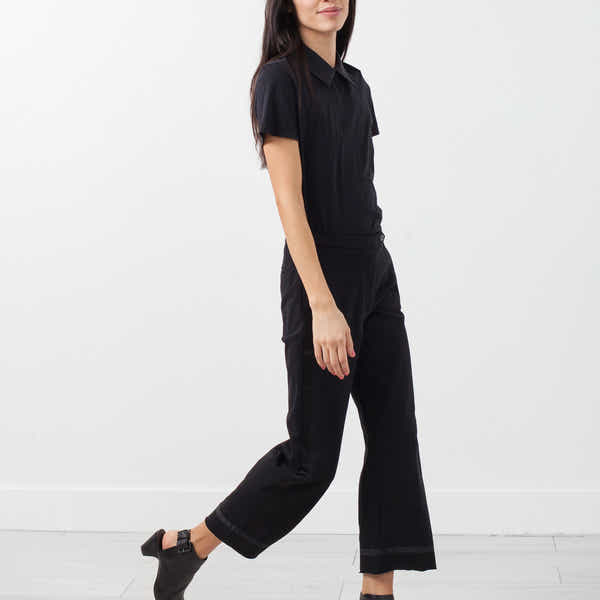 Manuela Arcari, designer of Hache and its sister brand TER ET BANTINE, approaches her second ready-to-wear line with a motive to create "perfect imperfections" within each collection. A myriad of references are blended for an off-center wardrobe. The Banda Trouser is the classic straight-leg pant with racing stripe detail. Side angled pockets at front. Single button with zip fly, hook and eye closure at front. Color Black. 100% Cotton, 2nd 100% Viscose, Lining 100% Cotton. Made in Italy. Ashley is wearing a Size 40.