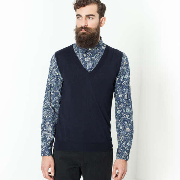 A lightweight sleeveless v-neck sweater with raised back seam is designed to keep your look simple and classic. Perfect accompaniment to a robust jacket or blazer. Color Navy. 50% Wool, 30% Silk. Made in Italy. Addis is wearing an Italian 50. Addis is 6’2”, Chest 38.5”, Waist 31”, Inseam 32”.