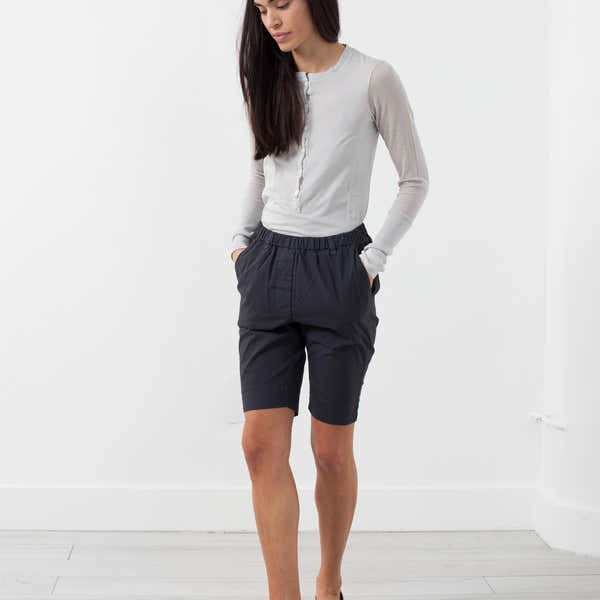 The Basic Short by Kristensen du Nord presents a flattering length silhouette to women's frame. Side angled pockets at front, two pockets at back. Elastic waistband for easy fit. Color Castel Rock. 96% Cotton, 4% Elastane. Made in Italy. Ashley is wearing a Size 1.