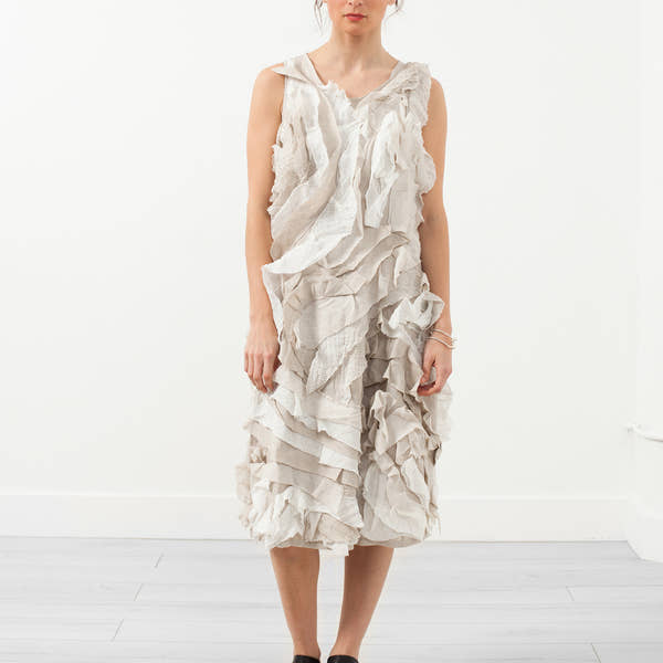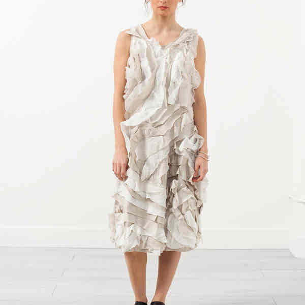 With international recognition for his work, Ivan Grundahl is a new Baby & Company favorite. Scandinavian designer experiments with architectural shapes while inherently chic. Muted palette, variance of texture, and asymmetry are exhibited throughout the collection. Princess seaming with an A-line silhouette is a flattering look on many shapes. Paired with the raw texture of natural linen, the Bean Dress is an exclusive match. Invisible zip closure at back. Color Natural. 100% Linen. Made in Portugal. Lana is wearing a Size 36.