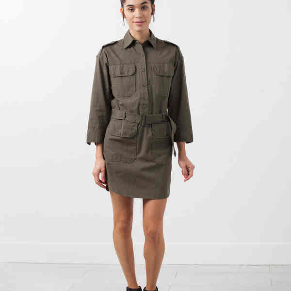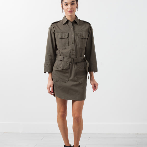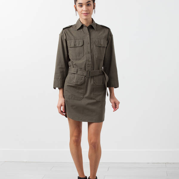 The Belted Surplus Dress from NLST presents a feminine army casual. Four exterior flap pockets at front. Half button down placket. Adjustable belt at waistband. 3/4 inch sleeves. Color Olive. 100% Cotton. Ashley is wearing an X-Small.