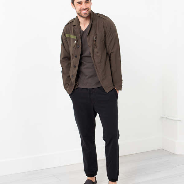 Sage de Cret is a menswear label made for men, and made to be worn as however they see fit. Paying homage to the vibrant tradition of menswear, their pieces are unconstrained by convention. The Zipper Jacket is a slim fit with an army aesthetic. Covered button placket at front. Two exterior zip pockets, side angle pockets at front. Mesh Lining. Color Olive. 100% Polyester. Made in Japan. Jacob is wearing a Large.