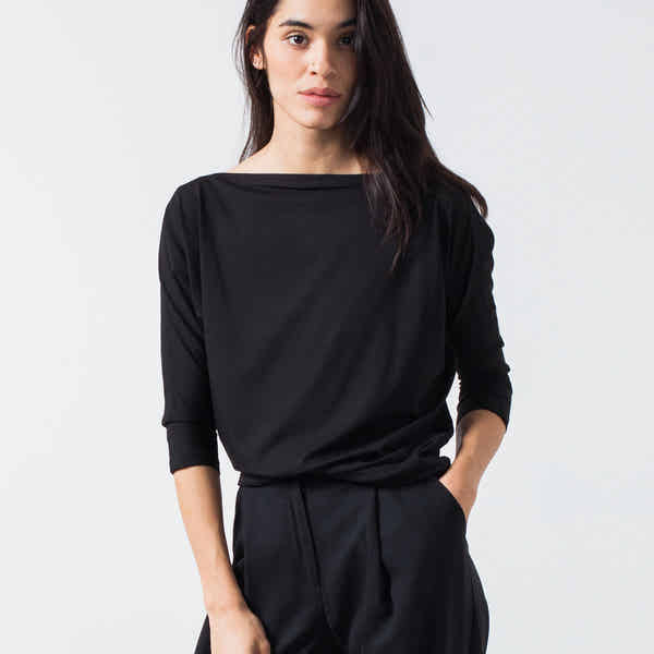 German designed with a minimal palette, Alexandra Schiess is on our radar. 3/4 sleeves, wide neckline, with a loose shape all combined represent the beautiful intellect that is the Boat Neck Top. Jersey knit for ease and comfort, this is the "anywhere" piece. Color Black. 94% Viscose, 6% Elastane. Made in Germany. Ashley is wearing a Small.