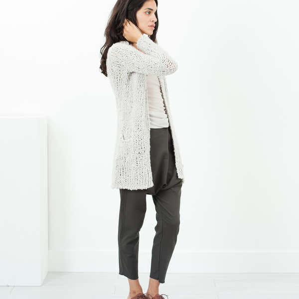 Manufactured at the foot of the Alps in Northern Italy, each Prïvate 02 04 garment undergoes a traditional "slow cashmere" hand washing process. A powdery soft open knit cardigan with a buttonless front, we image this cardigan held together beautifully by a rough leather belt as we stride across the Fjord. Color Cloud. 100% Hand washed Cashmere. Ashley is wearing a size 1.