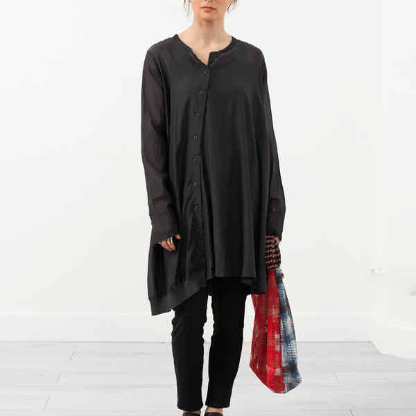 The Rundholz Black Label collection emphasizes accessibility in fashion. The Button Dress offers versatility in wear as a dress or layering top. Asymmetrical button placket at front. Accent ribbing at hem. Color Tang. 60% Cupro, 40% Cotton, 2nd Fabric 100% Cotton. Lana is wearing an X-Small.