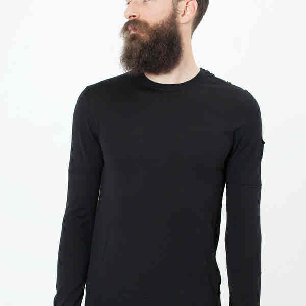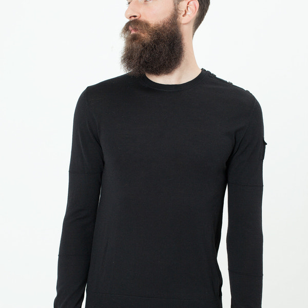 A thin and easy to layer merino wool sweater with four functional buttons at the left shoulder. Warmth and versatility is guaranteed. Color Black. Addis is wearing a size Small. Addis is 6’2”, Chest 38.5”, Waist 31”, Inseam 32”.