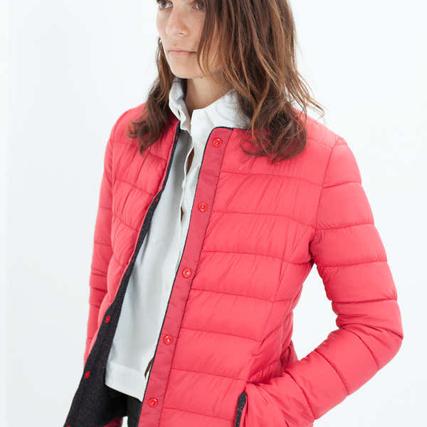 Truly versatile jacket of woven, tweed exterior, and ideal down ratio interior. Ready for one's diverse life schedule, this jacket offers the comfort, practicality, and look of the working women. Color Black/Red. Exterior 95% Wool, 5% Nylon, Lining 100% Nylon, Fill 90% Down, 10% Feather. Made in Italy. Lana is wearing an Italian 40.
