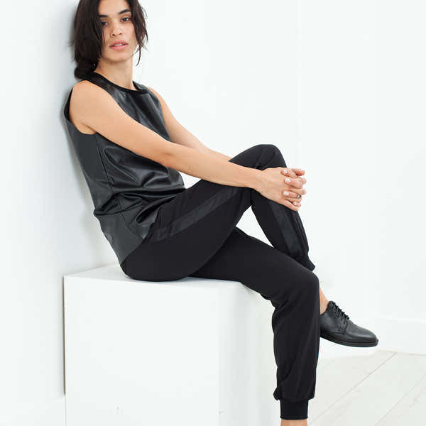 Sleek tapered pants with a tuxedo stripe and modernized with a smocked elastic waistband and ribbed-knit banding to cinch the cuffs. Side welt pockets and double welt pockets at the back. Color Black. 90% Shell Polyester, Exterior 96% Polyester. Ashley is wearing a German 34.
