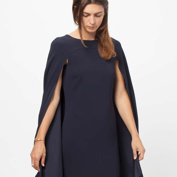 The Cape Dress from Co. captivates. The waistless silhouette offers a flattering look. Invisible zip closure at side. 82% Triacetate, 18% Polyester. Made in China. Ashley is wearing an X-Small.