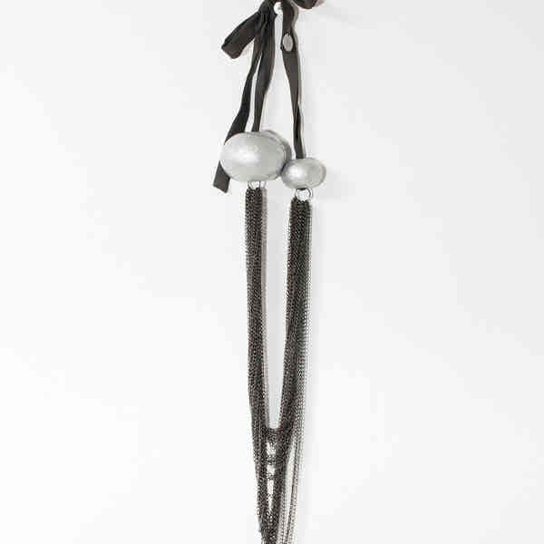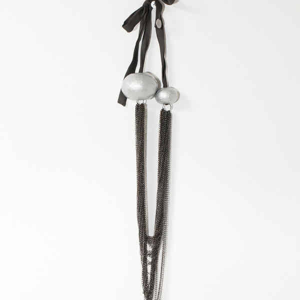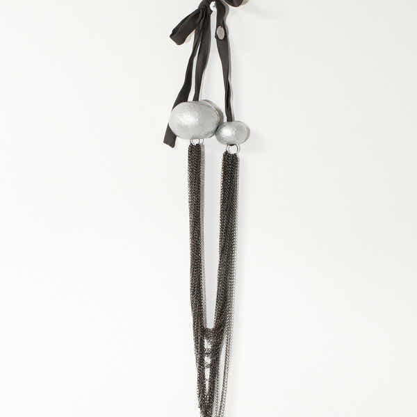 With chains that cascade like water, we can see where this multimedia necklace gets its name. Silk tie closure. Color Silver. Length 52", 7" Wide.