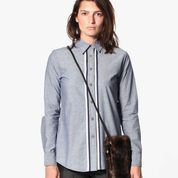 Happiness is a menswear-borrowed chambray shirt. A dashing cream and navy grosgrain ribbon lines the front placket. Back yoke traditional with an inverted pleat. Harvey Faircloth. Color Blue. 100% Cotton, Trim 100% Acetate. Made in U.S.A.