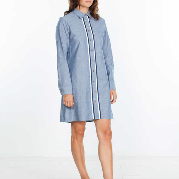 With all the insouciance of your boyfriend's button-down, this shirtdress adds in length, structure, and polish. Front and center a navy and cream grosgrain ribbon runs the length of the front placket. Back yoke with inverted pleat. Harvey Faircloth. Color Blue. 100% Cotton, Trim 100% Acetate. Made in U.S.A. Lana is wearing a size Small.