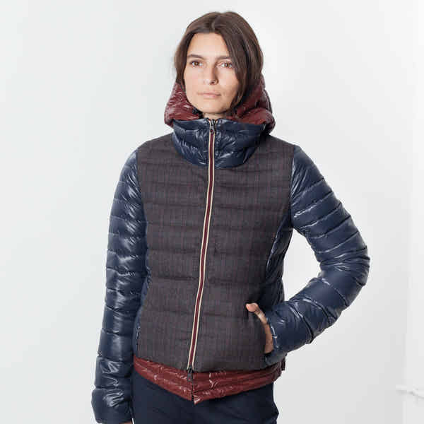 Remaining true to Duvetica’s label, the Cinosura Jacket offers warmth supplied by premium, grey goose down, and intelligent combinations of synthetic and natural fibers. Cozy slim fit with detachable hood insures versatility. Double angled front pockets, interior detachable pocket, Quilted front and back wool paneling. Color Navy. 30% Virgin Wool, 70% Polyamide, 100% Polyamide, Grey Goose Down. Made in Bulgaria. Lana is wearing the Size 42.