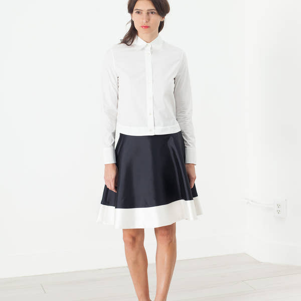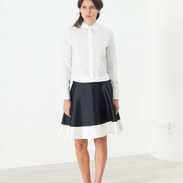 With the structure of wool, and a silk hand, the Circle Skirt from Harvey Faircloth is sophistication with just enough fun. Add some sway to your workday, or elegance to Sunday brunch. Invisible zip closure in back. Fully-lined. Color Navy. 51% Silk, 49% Wool, 100% Silk. Made in U.S.A. Lana is wearing a Size 2.