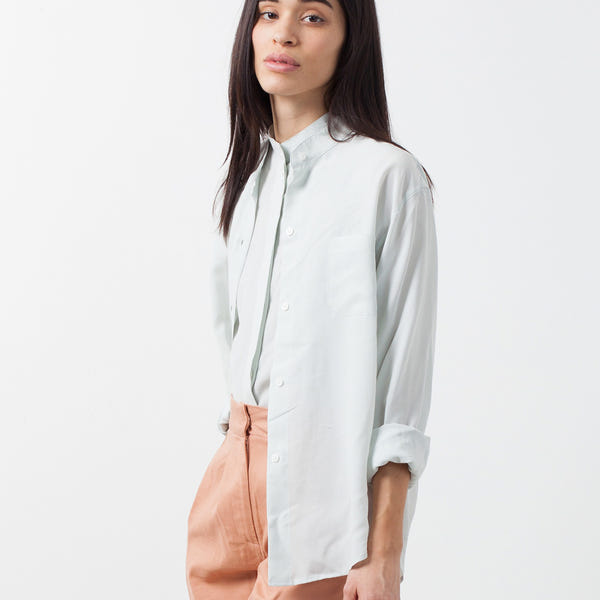The Classic Button Down from Jesse Kamm drapes gracefully across the form with enough structure to remain composed. Mandarin collar. Button placket closure at front. Breast pocket at left front. Color Sea Glass. 55% Cotton, 45% Lyocell. Made in U.S.A. Ashley is wearing an X-Small.