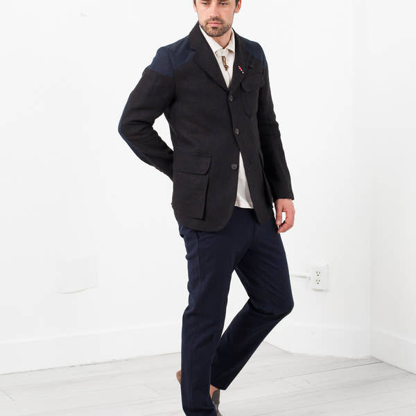 This heavy duty piece from Nigel Cabourn leaves room for your own stylistic interpretations. Three exterior flap pockets. Button placket closure at front. Standard lapels with adjustable collar button detail. Fully lined. Color Black. 100% Irish Linen, Lining 100% Cotton, 100% Viscose. Made in England. Jacob is wearing a 48.
