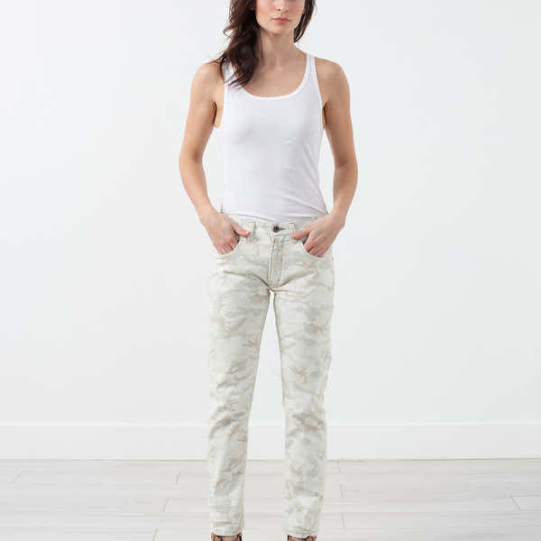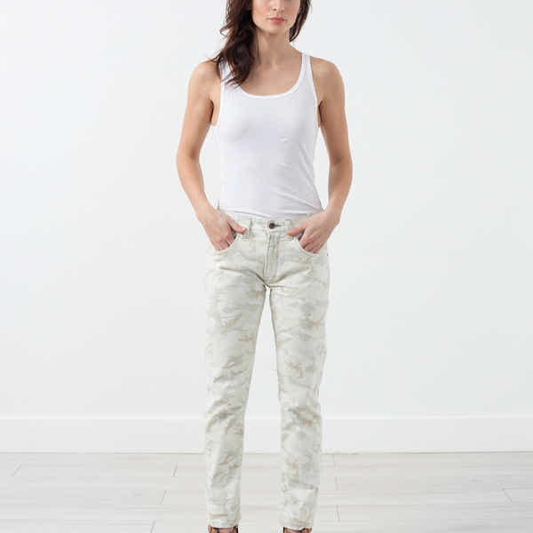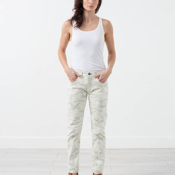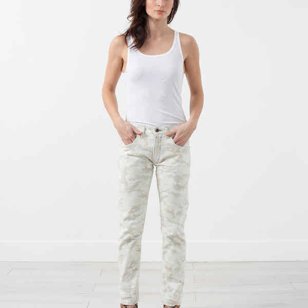 The Coinpocket Pant from Nicholson & Nicholson is lightweight with a classic, straight-leg silhouette. Five exterior pockets with contrasting garnets. Single button closure with zip fly at front. Corded material. Color Camo. 97% Cotton, 3% Polyurethane. Made in Japan. Lana is wearing a French 36.