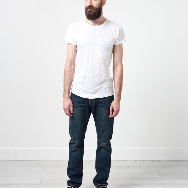 A subtle scoop to the neck and a flat lock seam in red down the spine of this soft cotton tee lets the world know you are keeping an eye on the details. Homecore. Color Off-White. 30% Cotton, 70% Wool. Made in Portugal. Addis is wearing a Small.