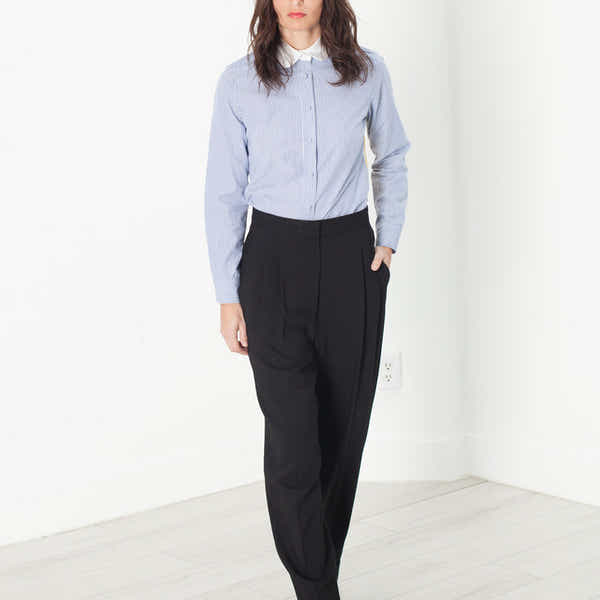 This high waisted silhouette is detailed with front pleats, angled side pockets and faux back pockets for a slim profile. A tapered leg reveals tonal sateen tuxedo-like cuffs. Color Black. 96% Viscose. Lana is wearing a German 38.