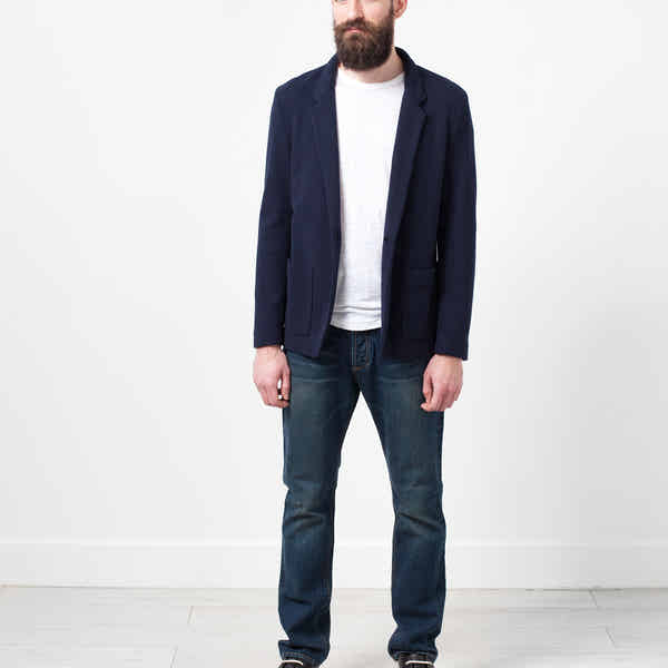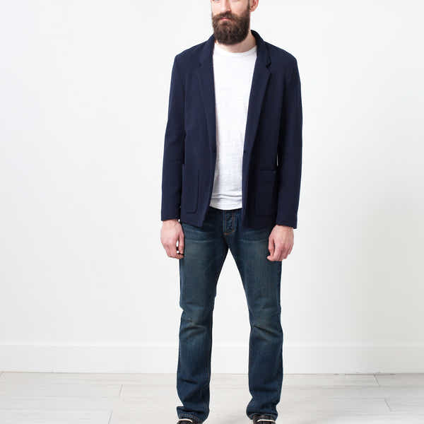 This knitted blazer from Mauro Grifoni presents the comfort of a cardigan with the structure of a suit jacket. Durable yet presents subtle softness in appearance. Tailored lapels, front facing pockets, and single button opening. Color Navy. 100% Cotton, 57% Viscose Rayon, 43% Polyester. Made in Italy. Addis is wearing an Italian 48.