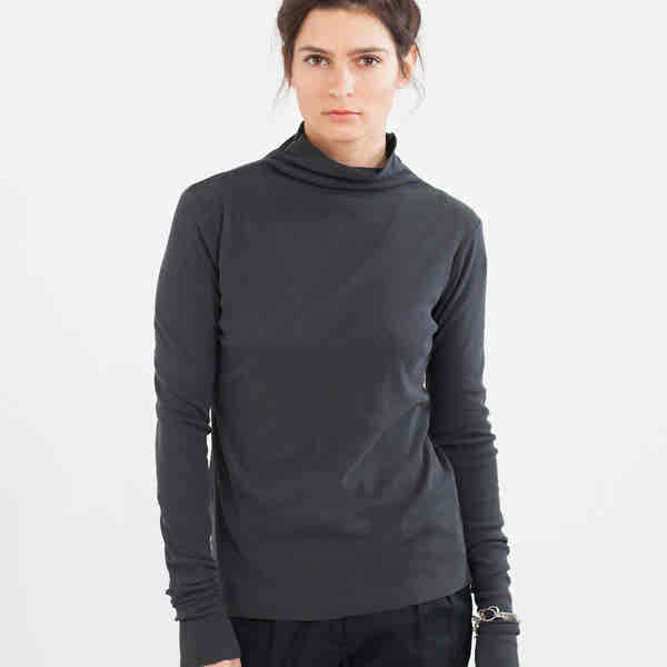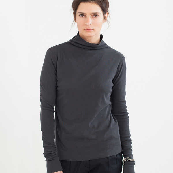 The Cotton Long Tee from Pip-Squeak Chapeau is not one's standard basic. Layered gauze renders the texture notable while not revealing. Raw edges caress this turtleneck. Color Ink. 100% Cotton Gauze. Made in U.S.A. Lana is wearing a Small.