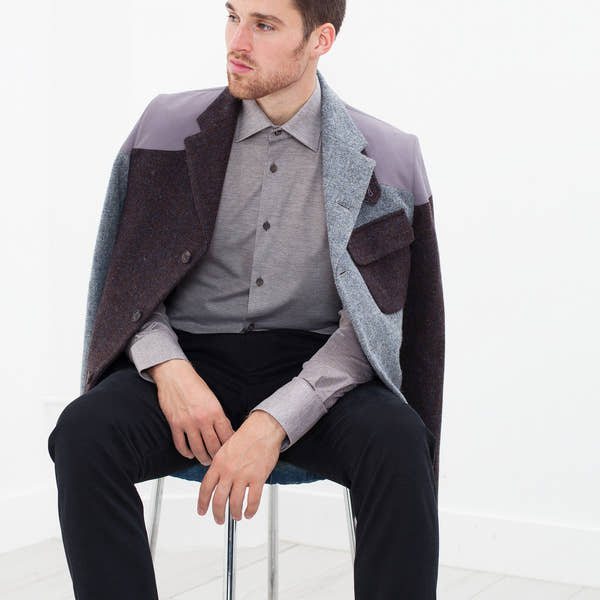 A patchwork of contrasting Harris Tweed signatures this jacket by Nigel Cabourn. Featuring a notched lapel, four button front opening with two large front patch pockets and a smaller chest pocket. Shoulder and elbow patches are water and wind resistant. Back vented hem. Color Blue Mix. Outer 100% Wool & Cotton, Inner 100% Viscose & Cotton. Spencer is wearing an Italian 50.