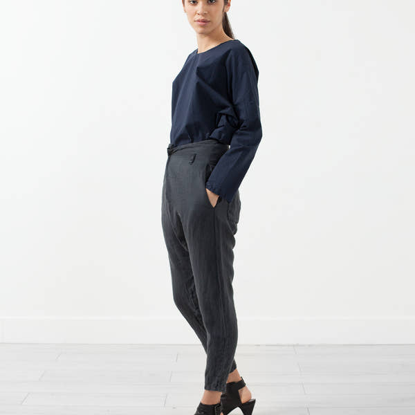 The Cross Trouser from Album di Famiglia offers a high waisted through drop-crotch fit of durable fibers. Single snap button closure at front. Side angled pockets at front, two exterior pockets at back. Color Charcoal. 100% Linen. Made in Italy. Ashley is wearing an X Small.