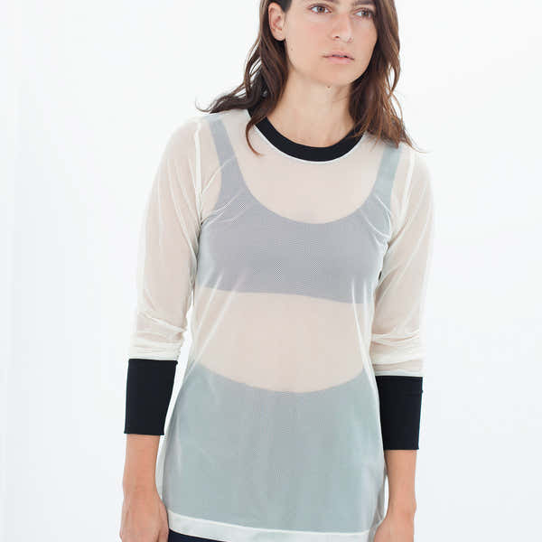 A fun take on the usual crew neck sweater, the ribbing at collar and cuff contrast the stiff mesh body, which promises never to stretch out and lose it's shape. Color Cream/Black. 100% Polyamide. Lana is wearing a size 2.