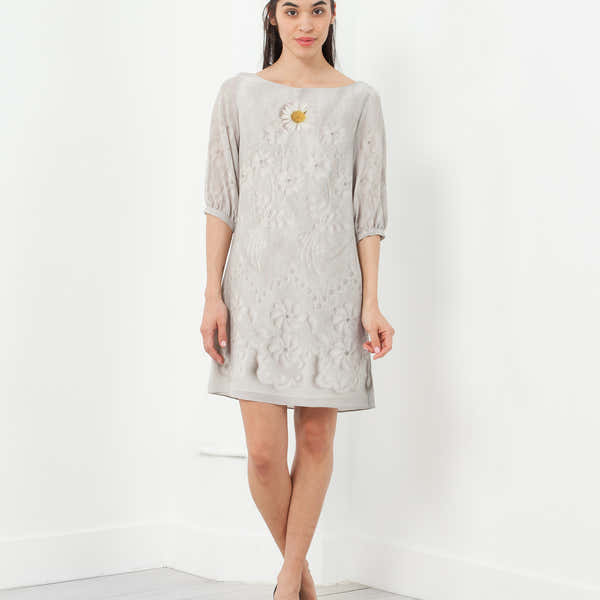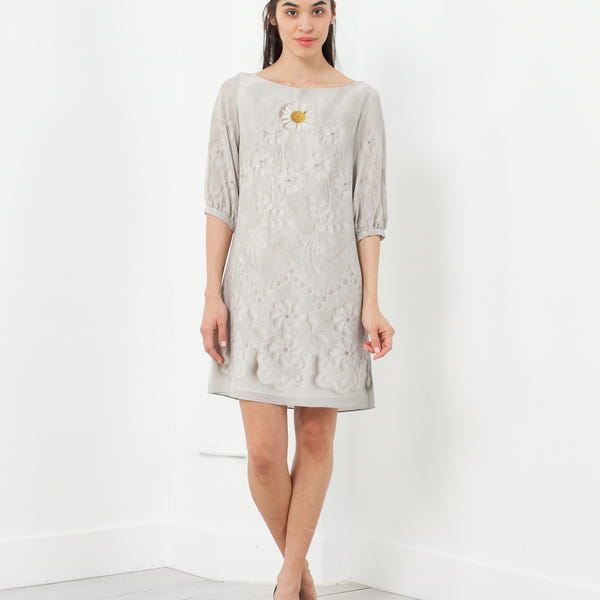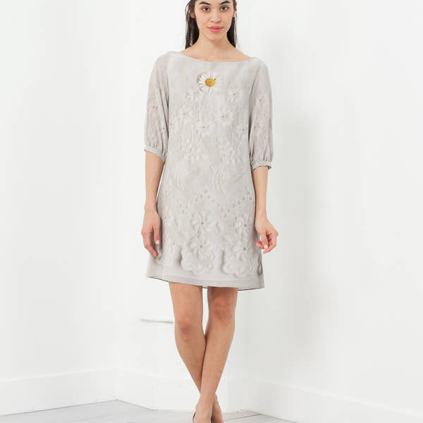 The designs of Antoni & Alison are a melange of trompe l'oeil digital imagery printed on fine silks, rendering a specified aesthetic that defines the brand and culls a dedicated clientele. The Daisy delights with its subtle textural printing and details. Flowing peasant sleeves. Wide boat neckline. Lining. Color Grey. 100% Silk. Made in the U.K. Ashley is wearing a Size 8.