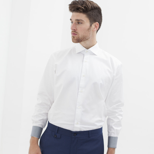 Circle of Gentlemen's crisp white shirt is indispensable for any man's wardrobe. A classic collar with sharp tailoring that will match virtually anything. Finished with a houndstooth print on the collar and lining of the cuffs. Color White. 100% Cotton. Spencer is wearing a size 41.