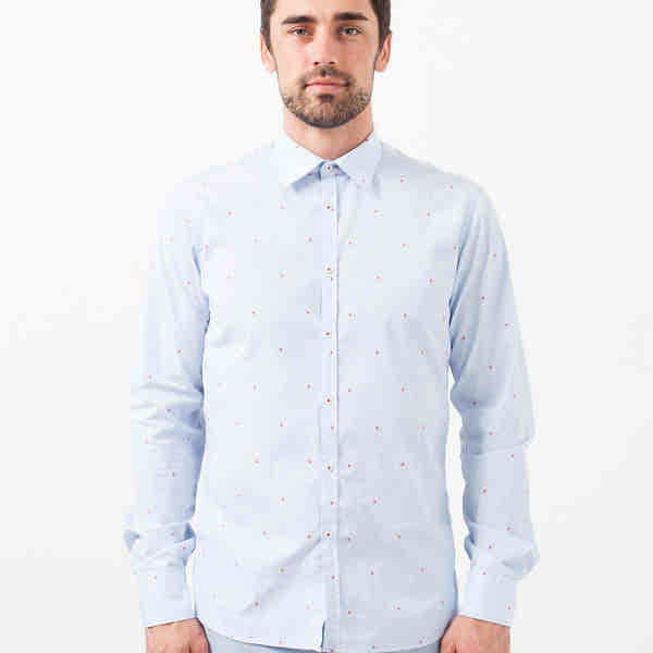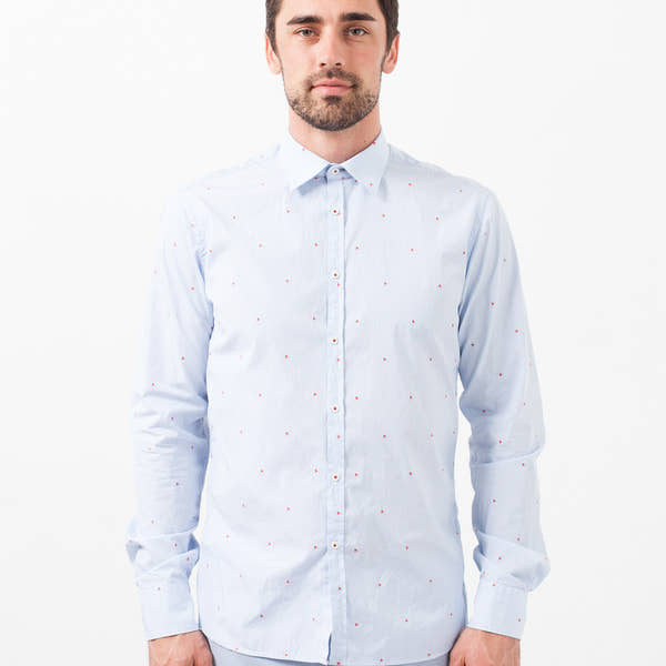 Created from the vast experience of its 41 founding members, this shirt delivers beautiful Italian tailoring and high quality fabrics and trims. The classic button down has back darts for a more tailored fit. Adorned throughout with embroidered, red hornets. Color Blue Hornet. 100% Cotton. Made in Italy. Jacob is wearing a Size 41.