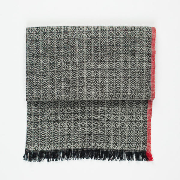 Hand-woven with care, rhythmic in pattern, and attractive in texture. Fringe accents. Khadi & Co. Color Black/Natural. 100% wool. Made in India. Length 32" X 80".