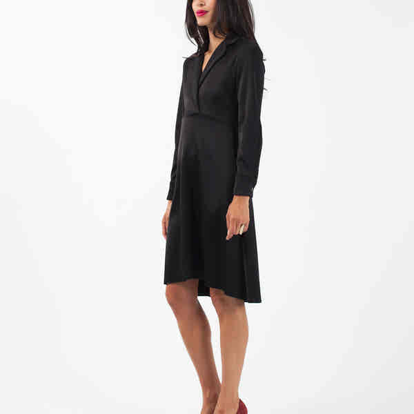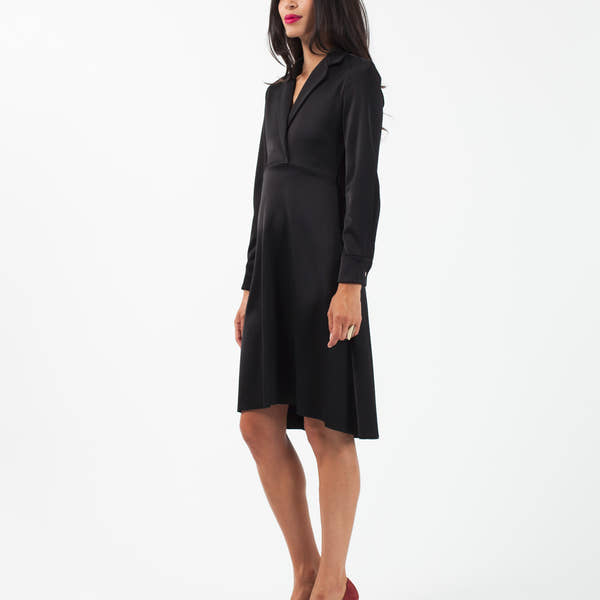 The Surplice Dress from Co. is seductively soft. Flattering V-neckline framed with lapels. Invisible zip closure at side. Color Black. 49% Polyester, 48% Viscose, 3% Elastane. Made in China. Ashley is wearing an X-Small.