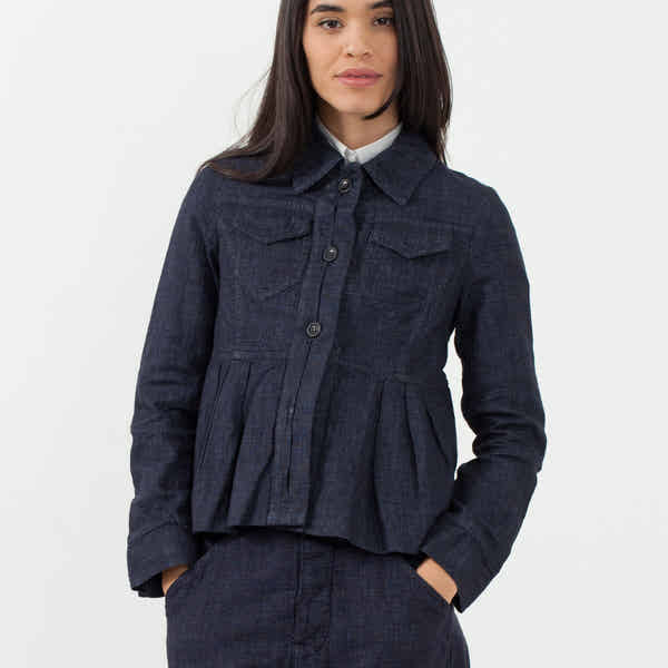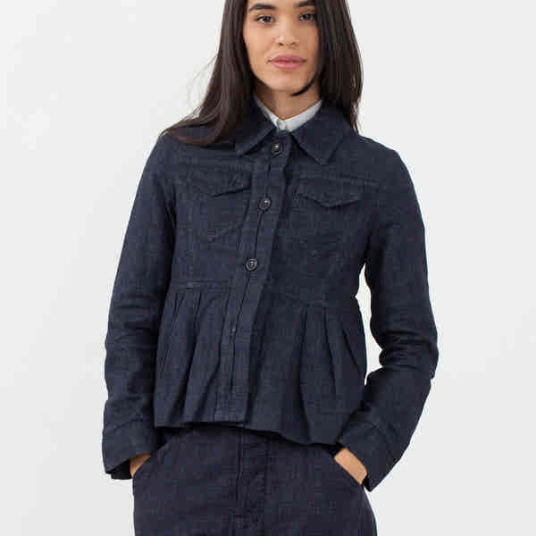 The Eleve Jacket is comfortable, lightweight, with just the right amount of casual. Trim silhouette, flairs at waist. Button placket closure at front. Two interior pockets. Hannes Roether. Color Deep. 100% Cotton. Made in the EU. Ashley is wearing an X Small.