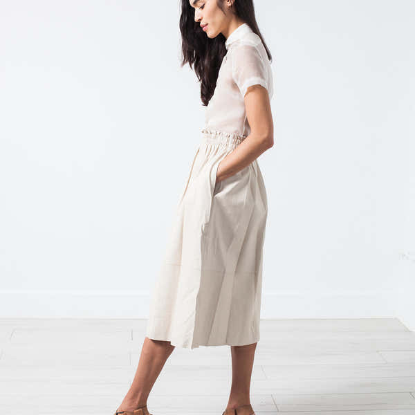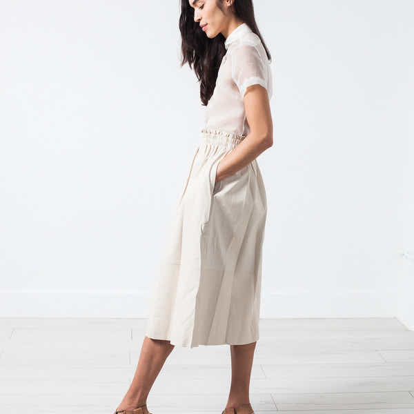 The Eulera Leather Skirt by Malene Birger adds needed contrast of variety. Creates classic and statement looks with its potential diversity. Delectably smooth, the sheepskin leather adds a splendid touch. Hem lengths past knee, with an easy waist band. Color Cream. 100% Leather, 57% Viscose, 43% Polyester. Ashley is wearing a European 34.