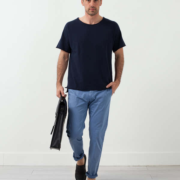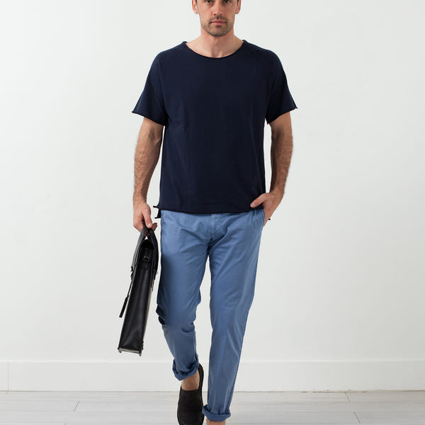 The Fitted Trouser is an easy wear for mixing and matching. Straight fitting leg through the ankle. Three button closure with zip fly. Four exterior pockets. Berwich. Color Blue. 97% Cotton, 3% Elastane. Made in Italy. Jacob is wearing a Size 50.