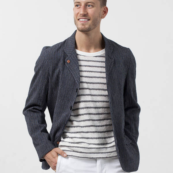 Veering towards nautical inspired, the Five Button Blazer is lightweight while cool. Button closure at front. Hansen. Color Indigo Stripe. 100% Cotton. Made in EU. Matt is wearing a Medium. Matt is 6’2”, Chest 38”, Waist 31”, Inseam 34.5”.
