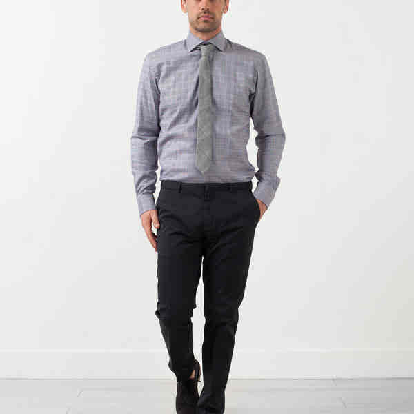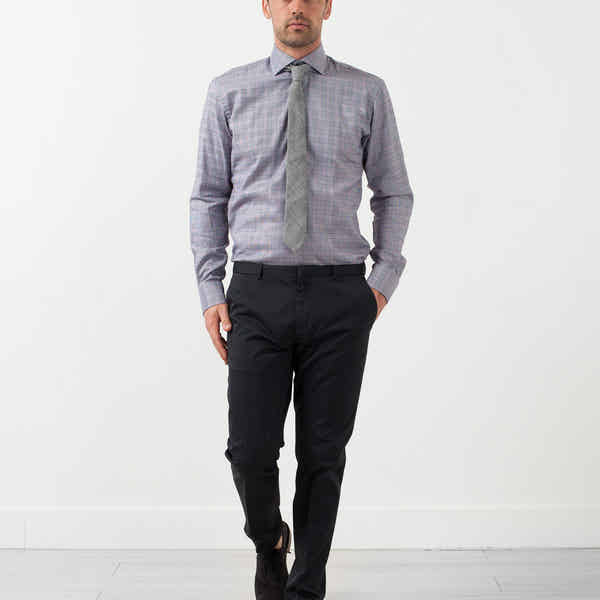The Freeman acts as the standard Circle of Gentlemen shirt in excellence of tailoring. Button placket closure at front. Color Purple. 100% Cotton. Made in Turkey. Jacob is wearing a Size 39.
